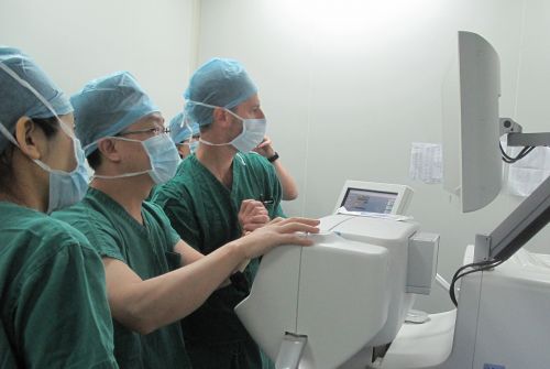 ▲張廣斌院長(zhǎng)為患者做飛秒白內(nèi)障手術(shù)