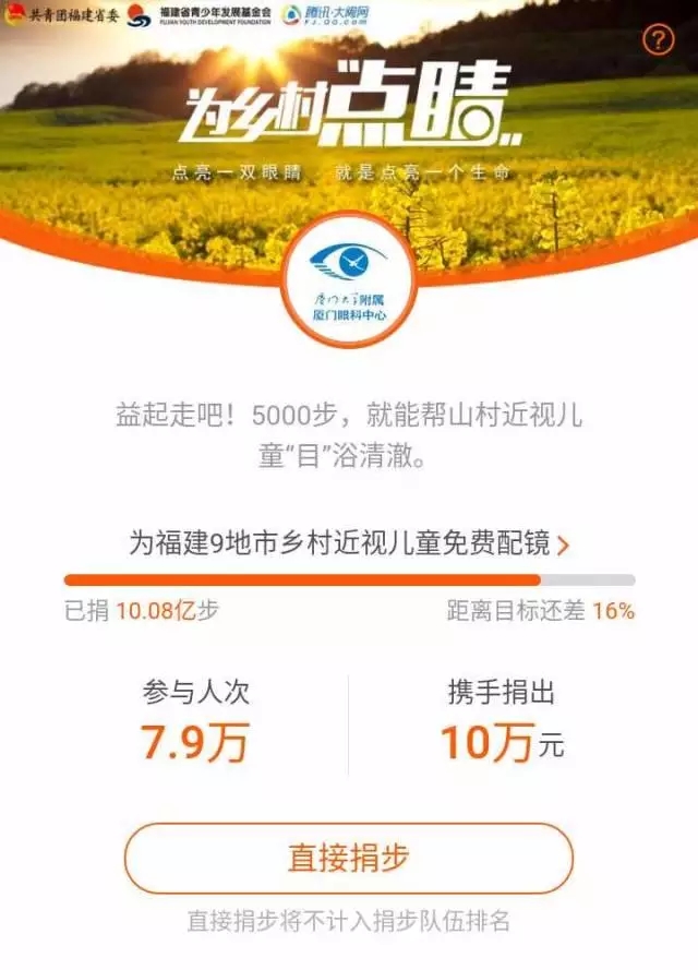 全民暴走,以5000步為起捐門檻,網(wǎng)友捐出的每一次5000步,廈門大學附屬廈門眼科中心都將捐出相應的配捐資金。目前,已為福建9地市鄉(xiāng)村近視兒童配鏡累計捐出10億步,為近視兒童捐出10萬元。