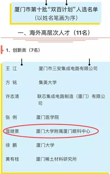 2018年1月25日,廈門市第十批引進高層次人才“雙百計劃”人選名單的公告及名單正式公布!歷經(jīng)半年時間申報、初審、網(wǎng)絡(luò)評審、現(xiàn)場答辯、市高層次人才引進專項小組會議研究和公示等層層篩選,最終世界眼遺傳病基因治療專家、華廈