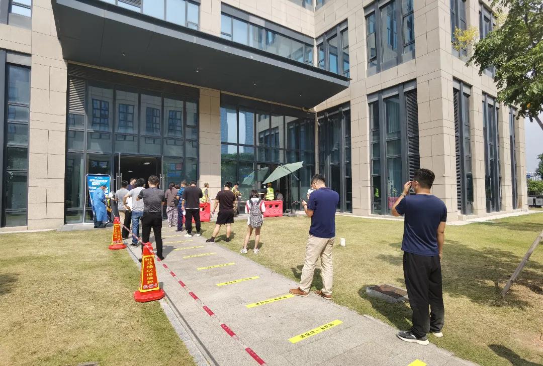 核酸采集現(xiàn)場,市民們在工作人員的現(xiàn)場督察引導下有序間隔一米排隊,醫(yī)院的全民核酸采樣工作十分高效、有序。