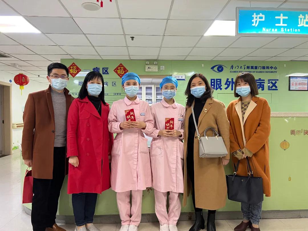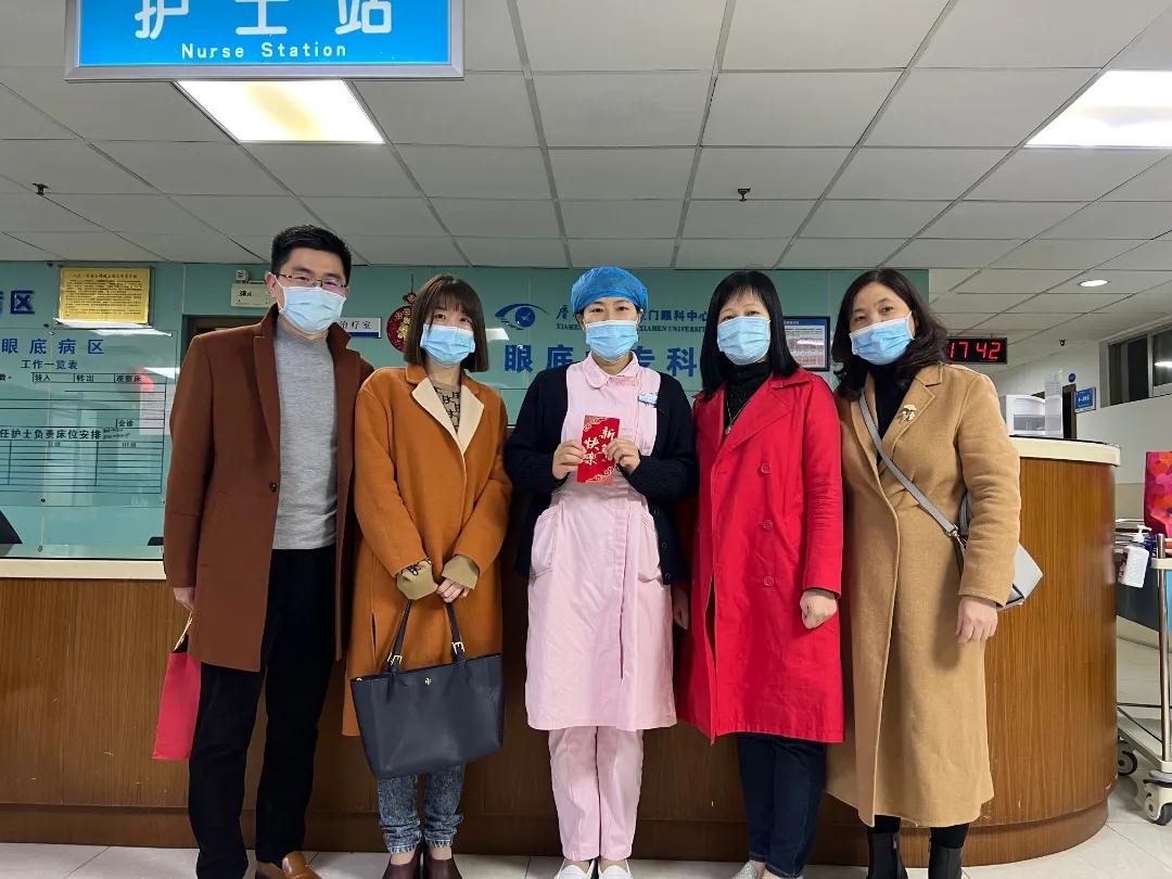 春暖大地百花艷,福滿人間萬象新。在舉家團圓的時刻,仍有人堅守在工作崗位。除夕當天,廈門眼科中心執(zhí)行總經(jīng)理姚鄭玲玲、副總經(jīng)理賴瑋玲、工會主席張美嫦、人力資源部總監(jiān)石磊等院領(lǐng)導班子成員深入病區(qū),看望并慰問春節(jié)期間堅守一線的醫(yī)務(wù)人員、值班后勤人員,為他們送上真切的關(guān)懷與新春的祝福。感謝他們節(jié)日期間恪守盡職,就他們在過去一年中的辛勤付出表示肯定,對疫情防控緊要關(guān)頭做出的積極貢獻致以崇高的敬意。