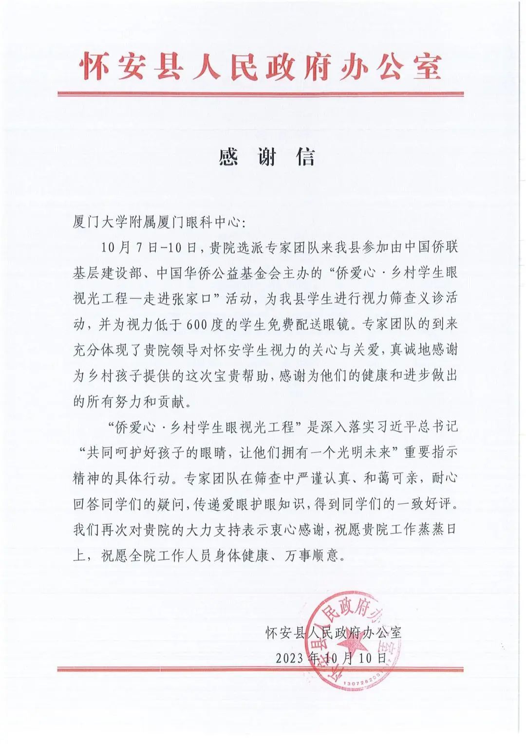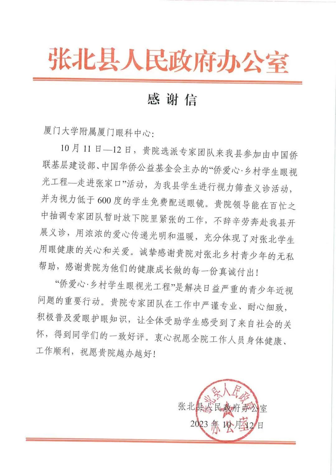 近日,廈門眼科中心接連收到來(lái)自中國(guó)僑聯(lián)基層建設(shè)部、懷安縣和張北縣人民政府辦公室的三封感謝信,信中對(duì)廈門眼科中心在“僑愛(ài)心·鄉(xiāng)村學(xué)生眼視光工程-走進(jìn)河北張家口”公益活動(dòng)中的無(wú)私付出及對(duì)鄉(xiāng)村孩子的寶貴的幫助給予充分認(rèn)可與真摯感謝。