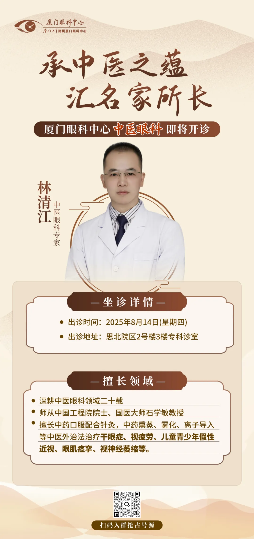 8月14日,林清江醫(yī)生將親自坐鎮(zhèn)廈門眼科中心中醫(yī)眼科門診,目前已開設(shè)專家預(yù)約通道。